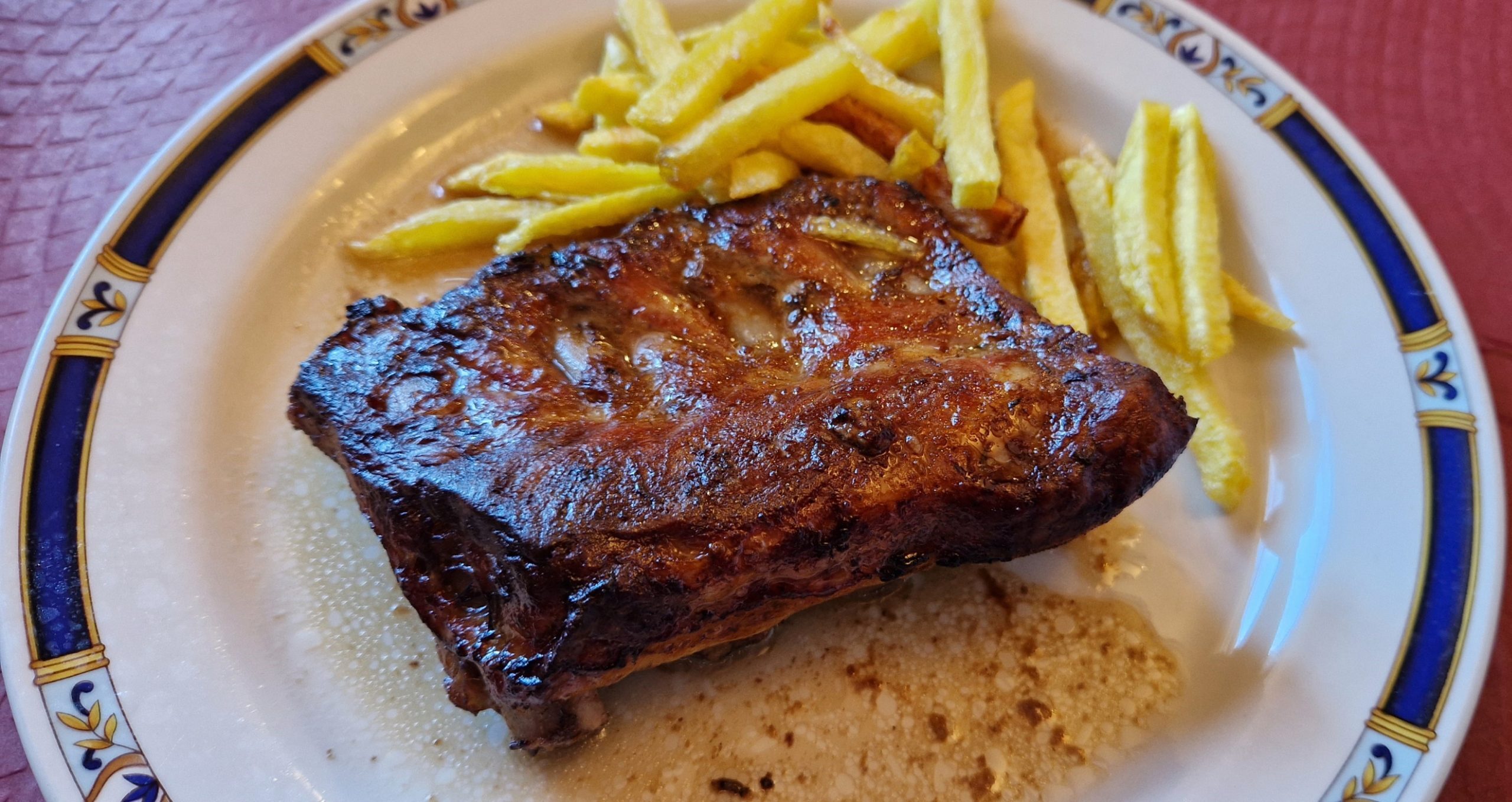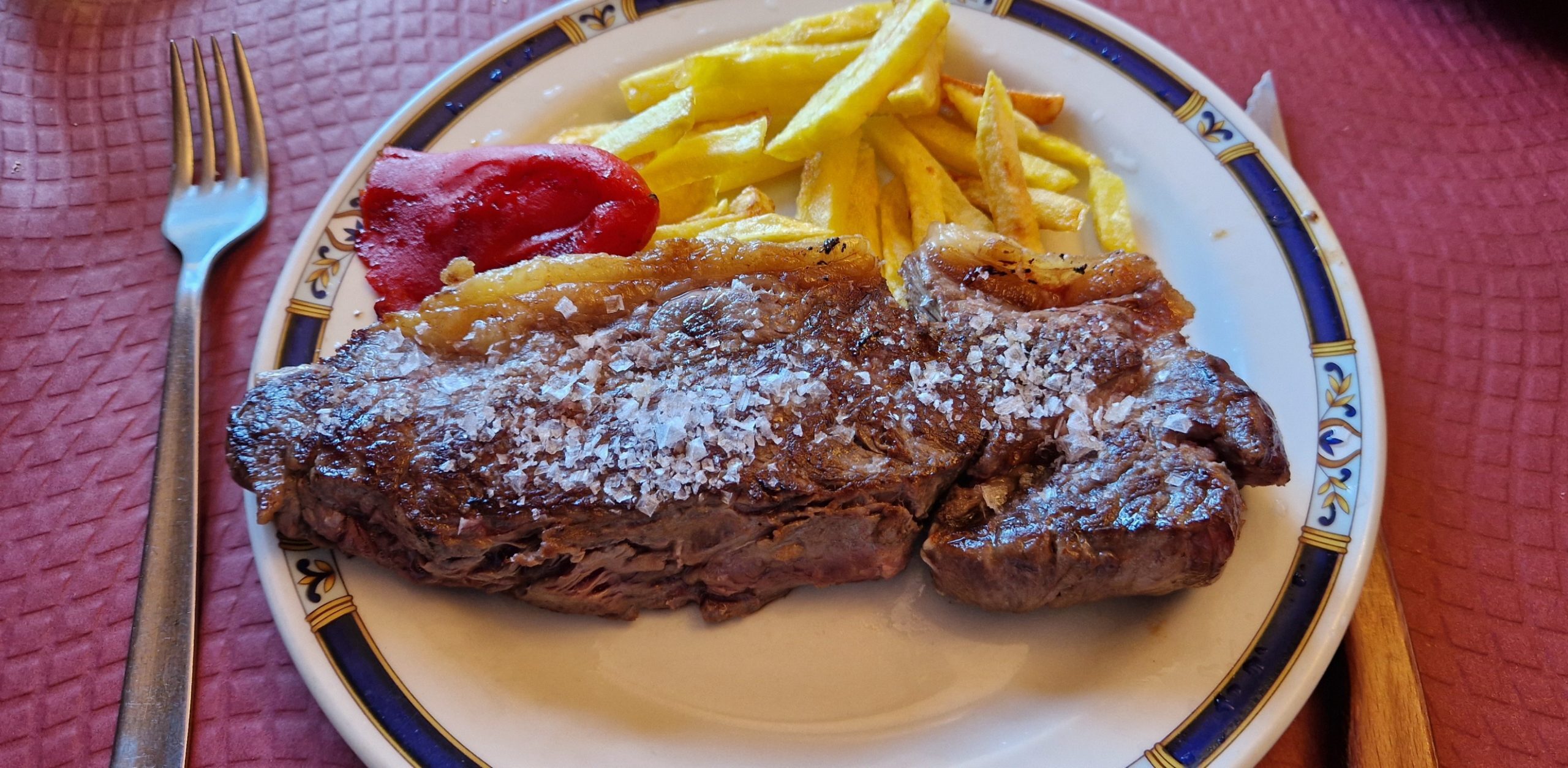 En segundos platos, Entrecot y Costilla al horno, ambos platos con acompañamiento de patatas fritas, y el entrecot también con pimiento de piquillo.