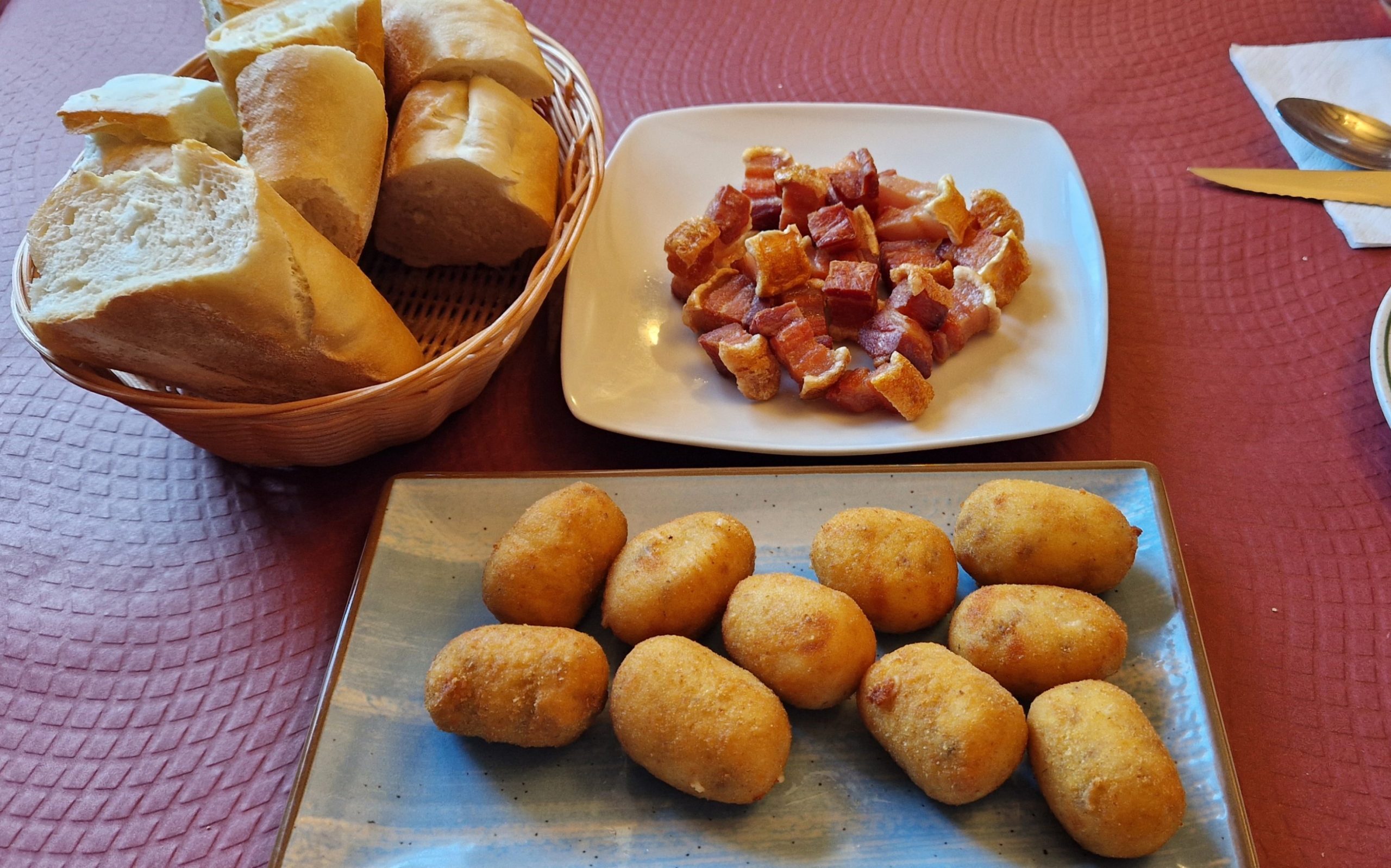 Como entrante compartimos unos torreznos y croquetas. Bien los torreznos, notables las croquetas: Buena bechamel con un poquito de pimienta blanca y una pizca de nuez moscada. Jamón que se sentía y bien fritas. Merecieron la pena.