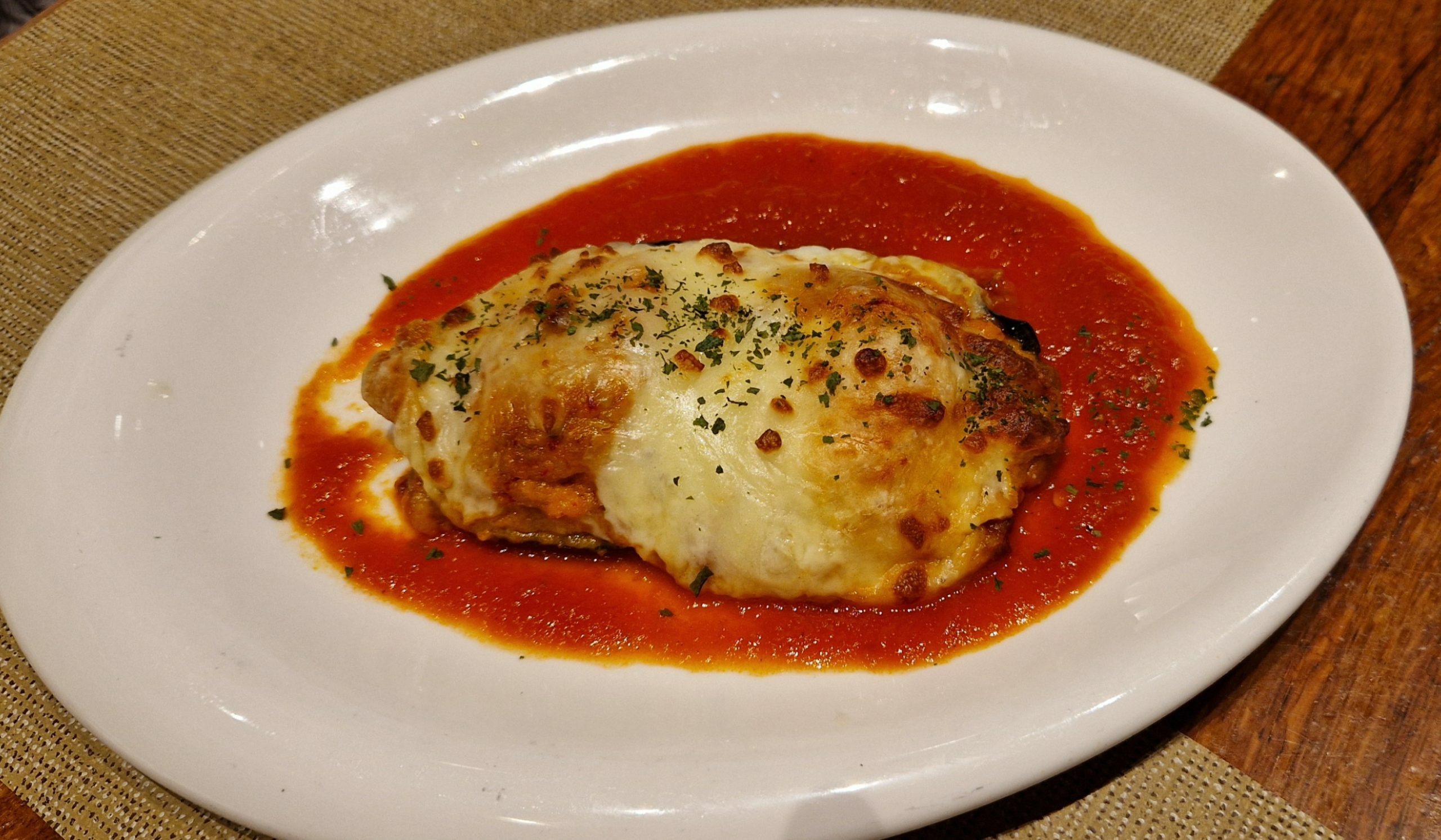 La berenjena, rellena de carne con piquillos y gratinada con mozzarella, también debe merecer la pena, si me dejo guiar por el placer con que Víctor la va devorando sin piedad.