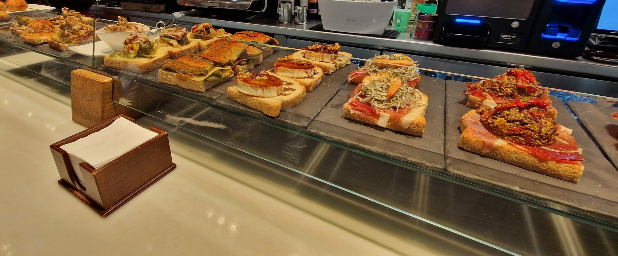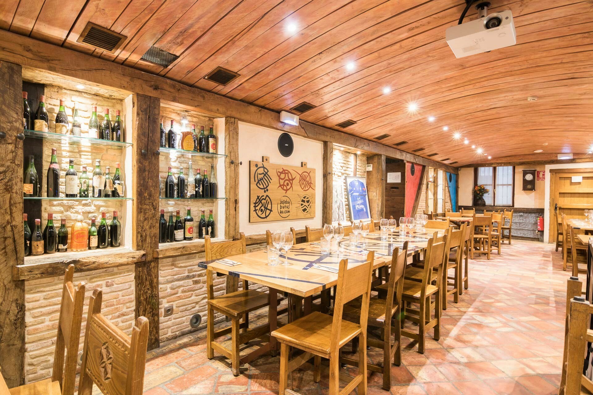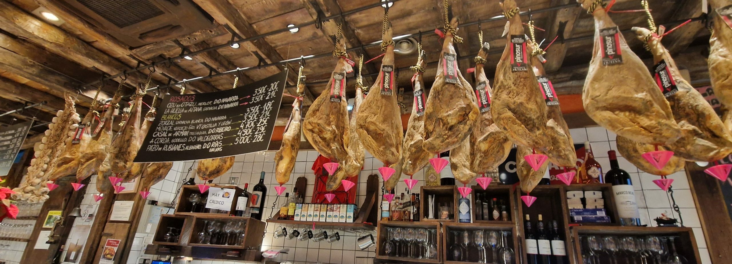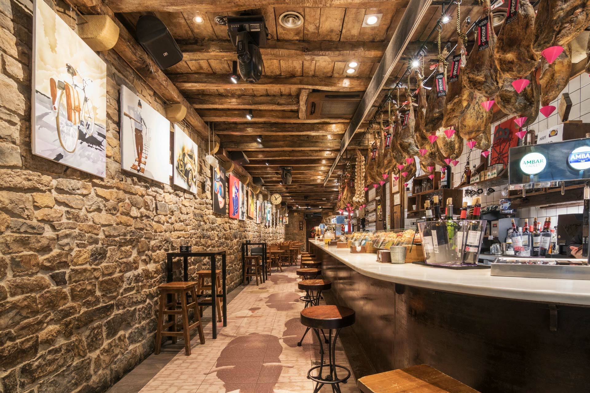 Entrando en el local nos encontramos una larga barra repleta de pinchos de todos los colores y sabores. Tapas hermosas en su tamaño, que harán las delicias de los hambrientos con ganas de solucionar sus apetitos con prontitud. Jamones colgados del techo, botellas de vino en paredes y estantes, decoración rústica. Al fondo los comedores y la cocina.