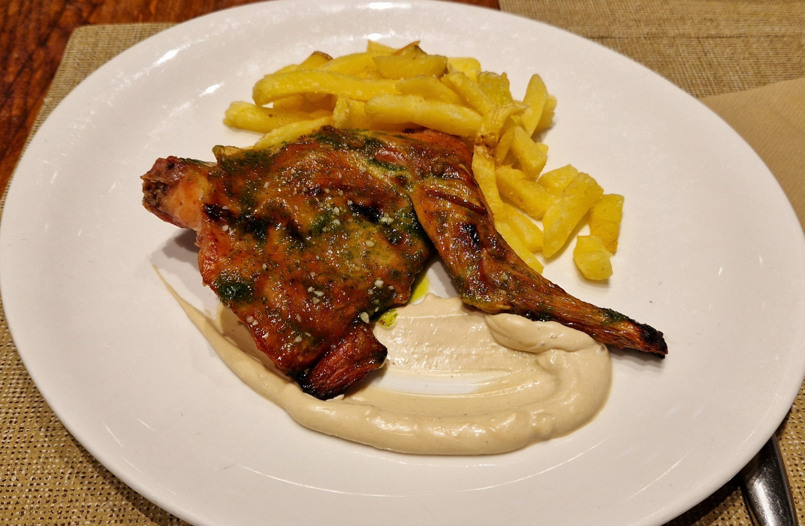 De segundos nos traen dos raciones de Conejo a la brasa con ajonjolí, ali-oli y patatas fritas, y una de Estofado de toro al vino tinto.