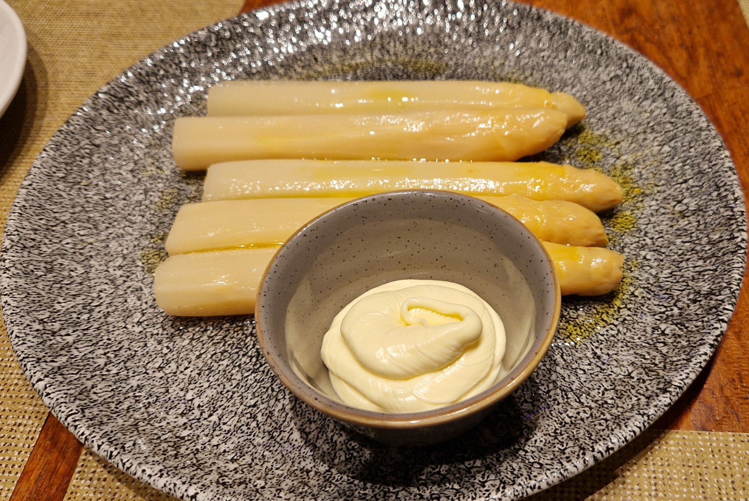 Empezamos con un plato fuera del menú: Espárragos con acompañamiento de mayonesa. De tamaño grande, jugosos. Muy buenos