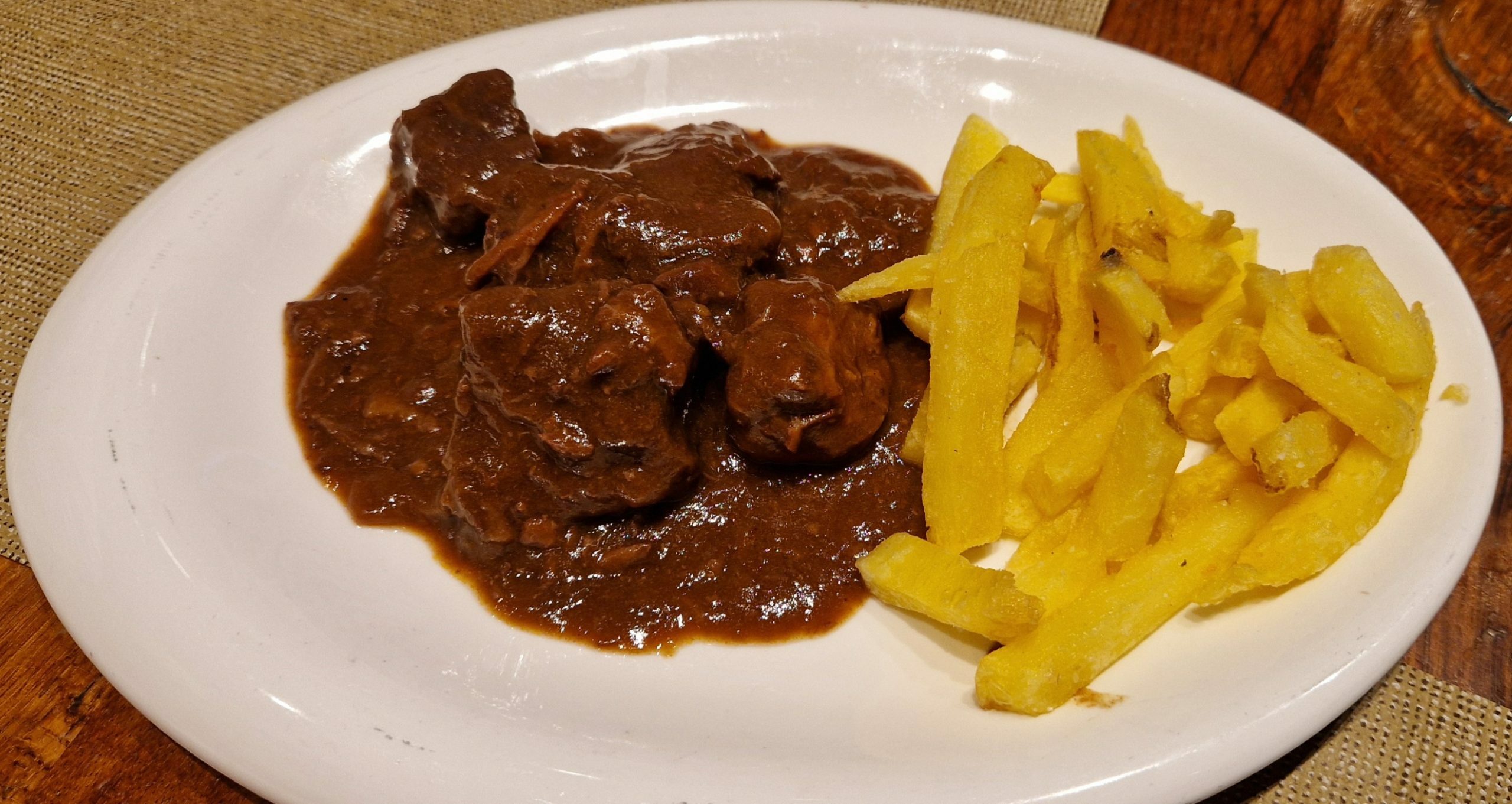 El Conejo en buen punto de brasa, con el acompañamiento de la salsa y unas ricas patatas fritas. El Estofado no lo probé, pero solo ver esa salsa densa en la que las verduras y el vino han hecho la magia culinaria, qué mejor prueba.