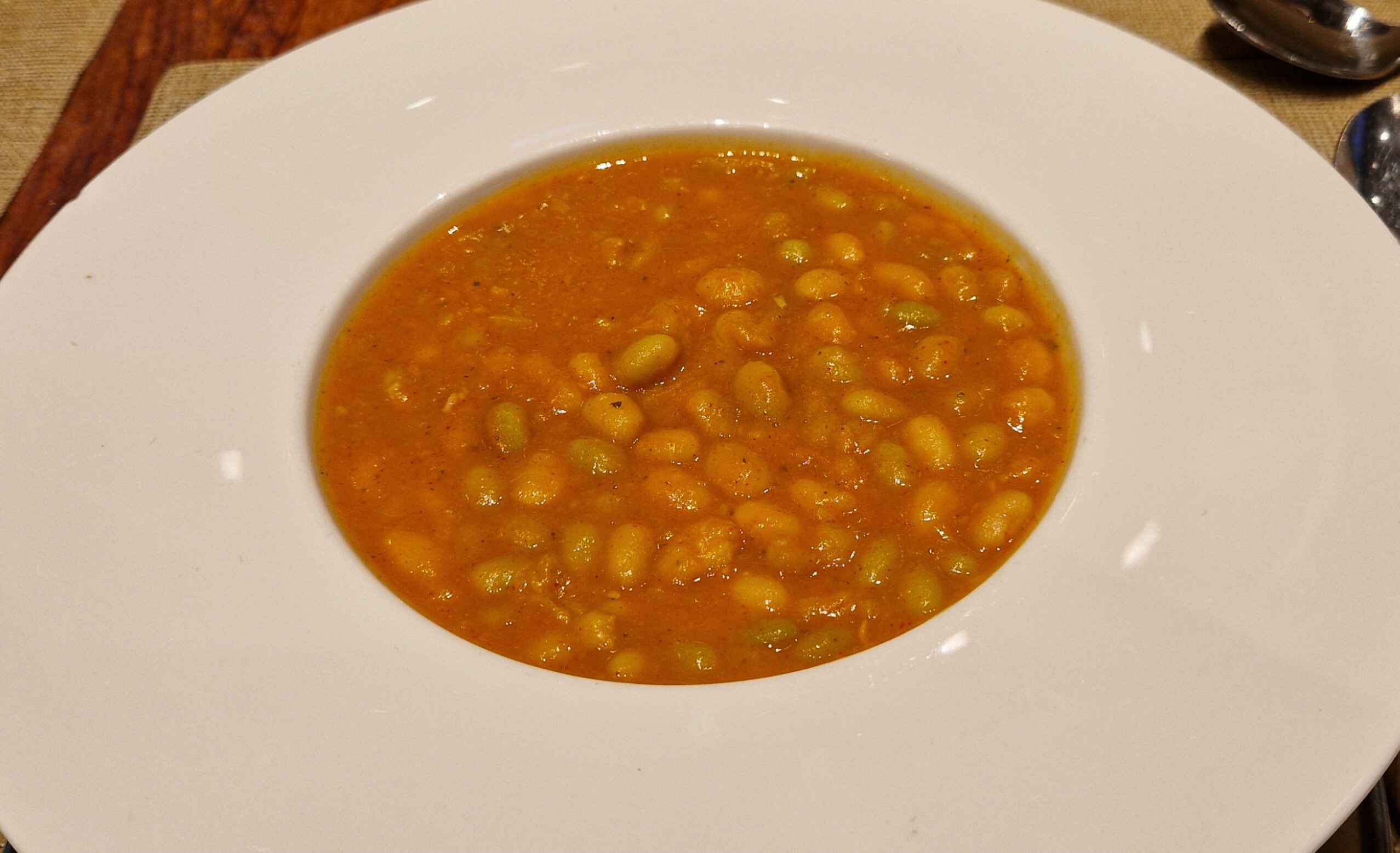 Las pochas guisadas con verduras, tiernas y sabrosas. En una mano la cuchara, en la otra una piparra, para ir dando bocados sucesivos a la ternura de la legumbre o al picantillo de la piparra encurtida.
